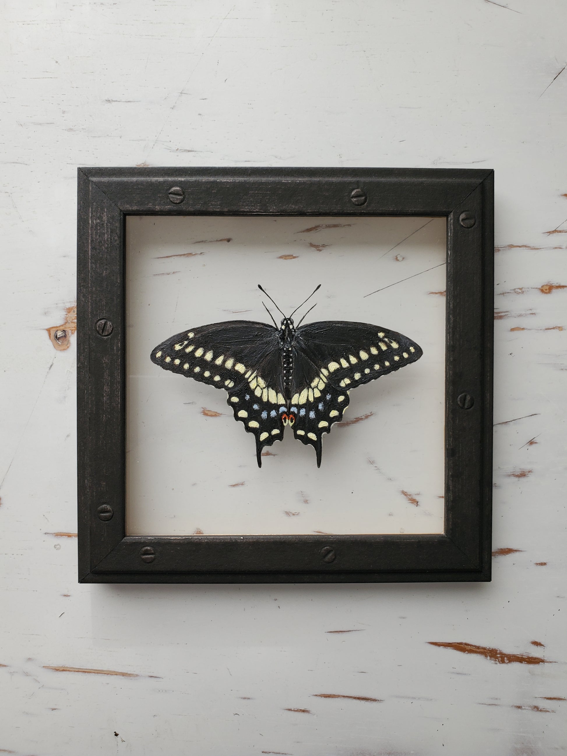 A black butterfly in a dark industrial-inspired frame with screw head details and subtle silver undertones