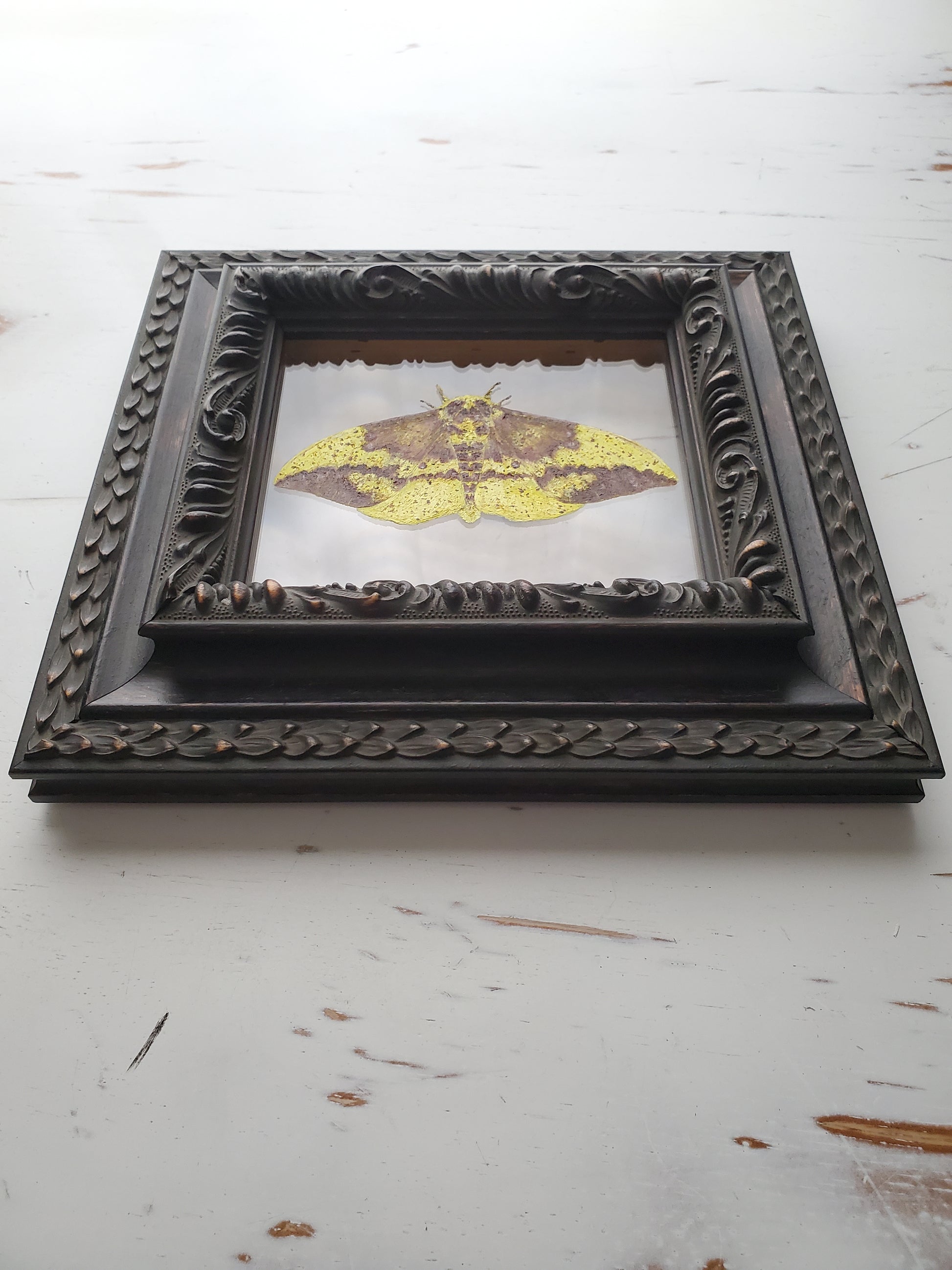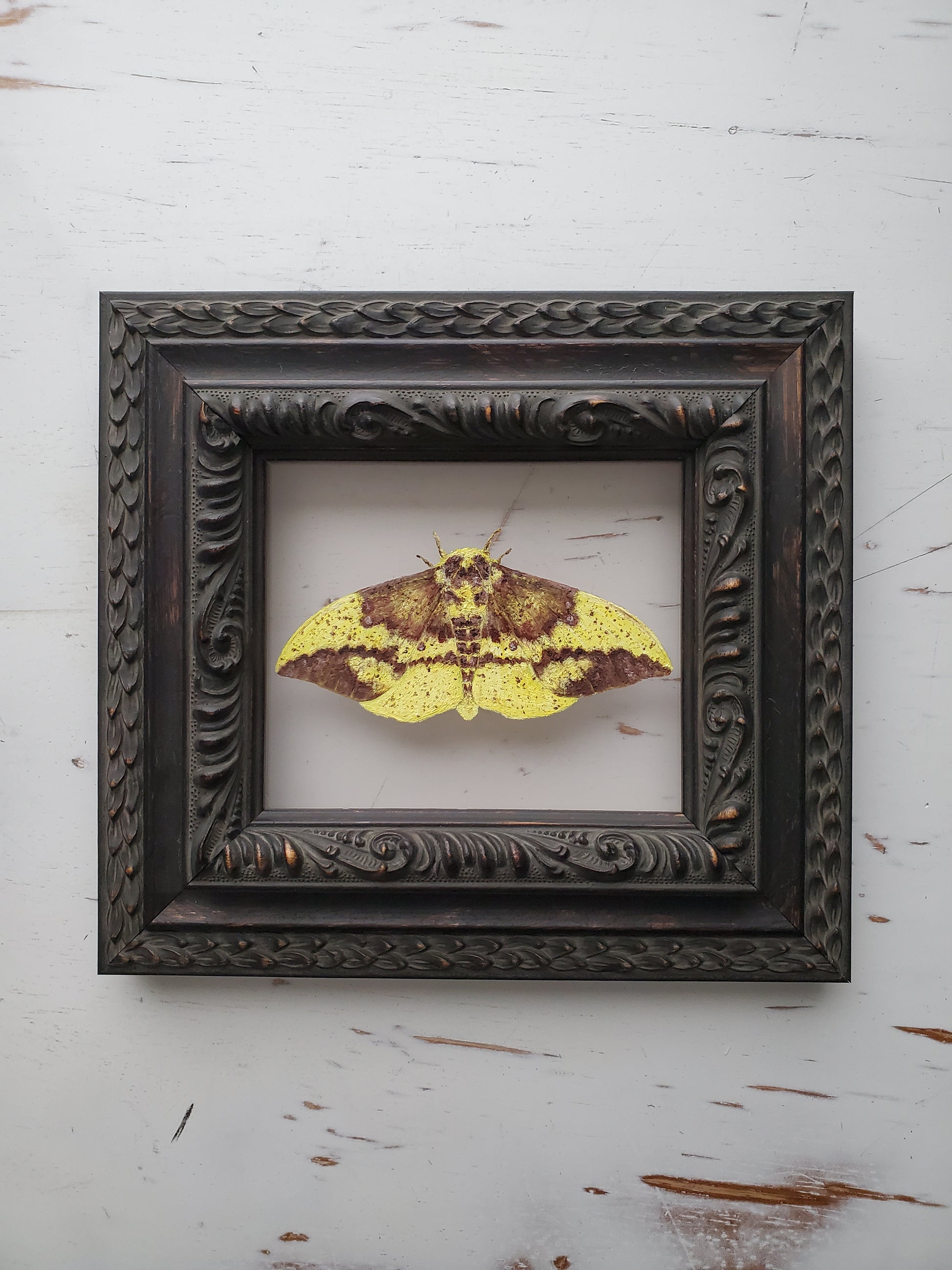 A yellow & brown moth in a dark frame with brushed bronze distressing and ornate carved details