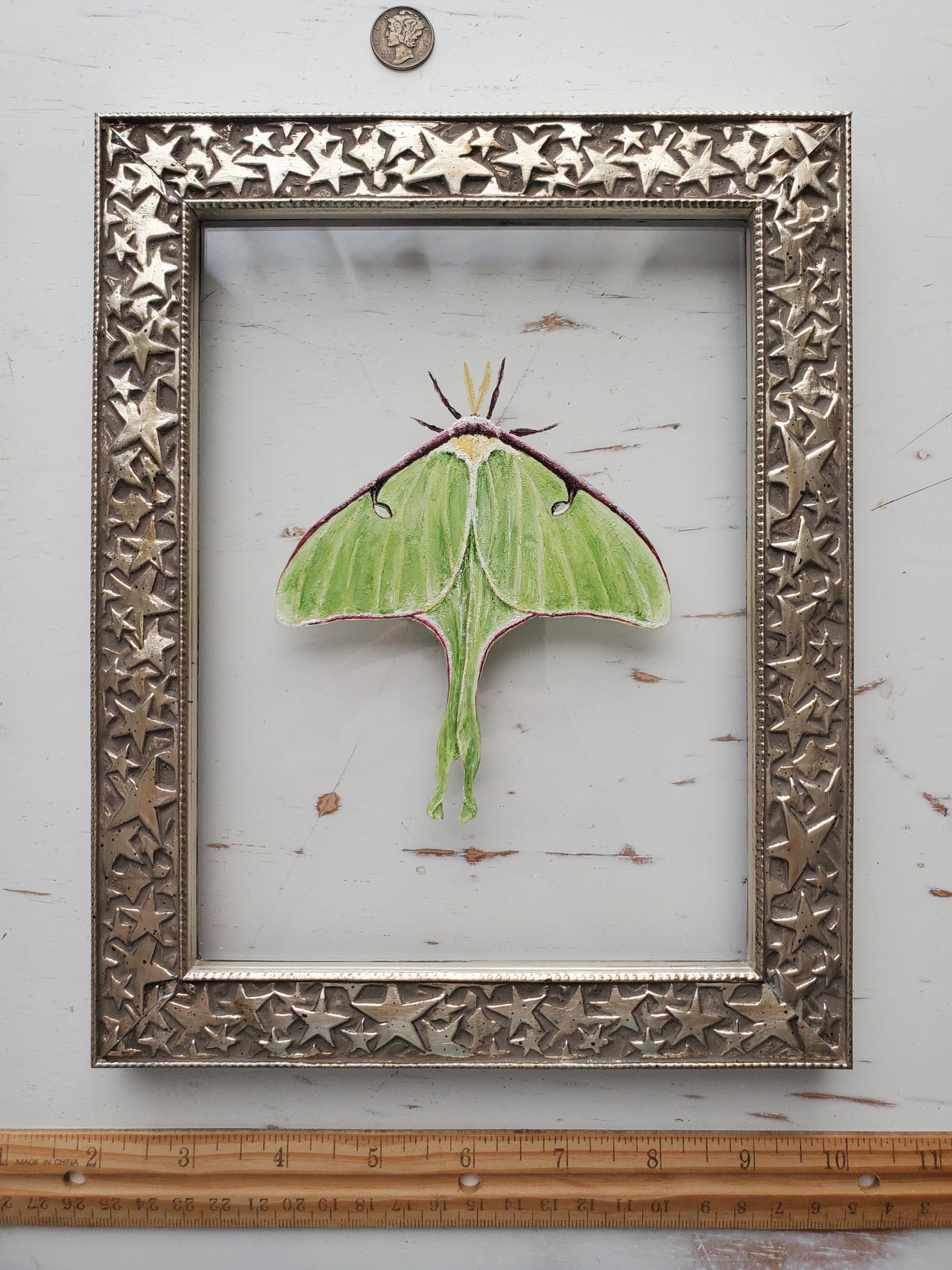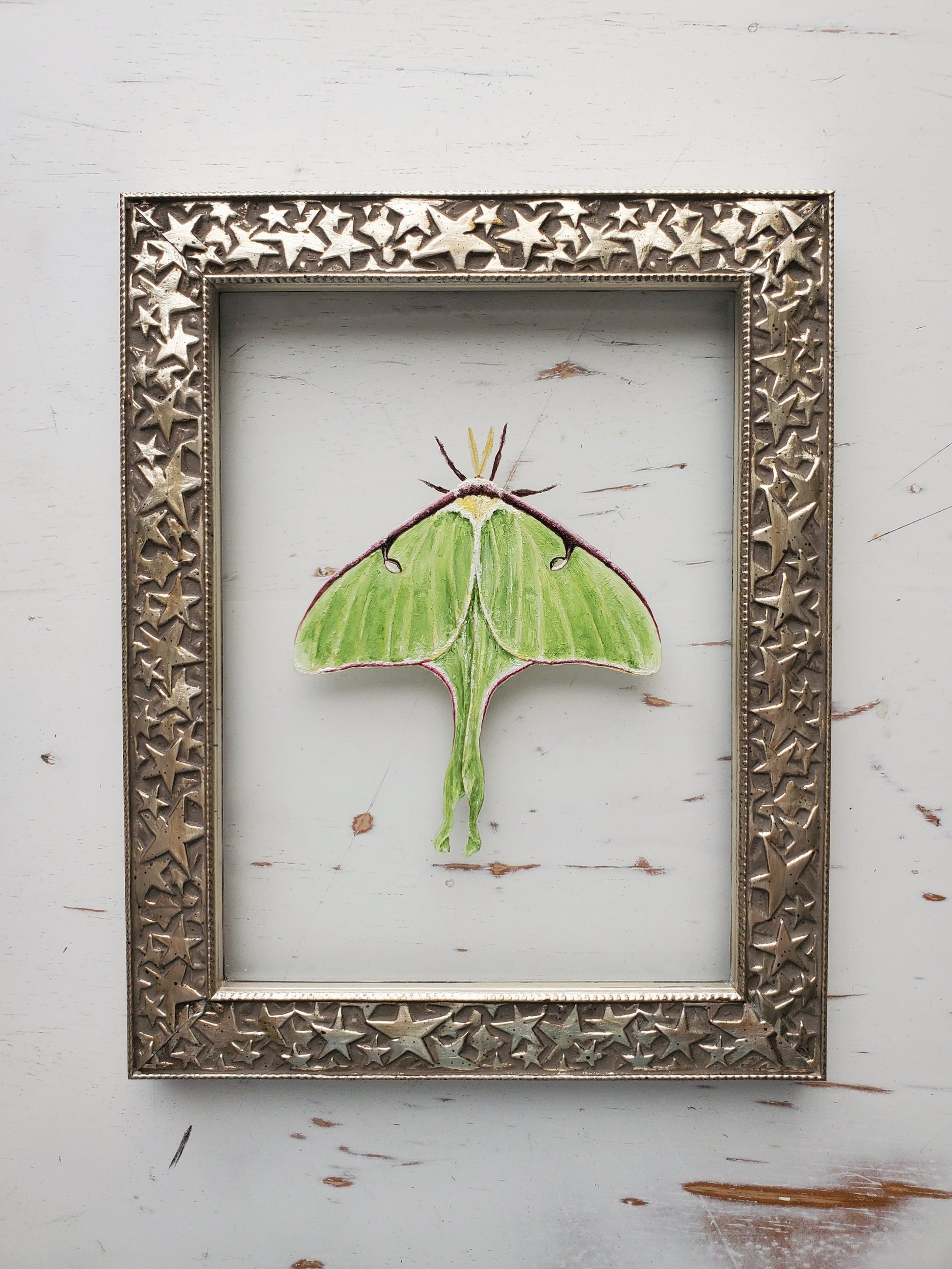 A green moth in a silver frame with whimsical starry pattern; lightly distressed look with soft speckles throughout