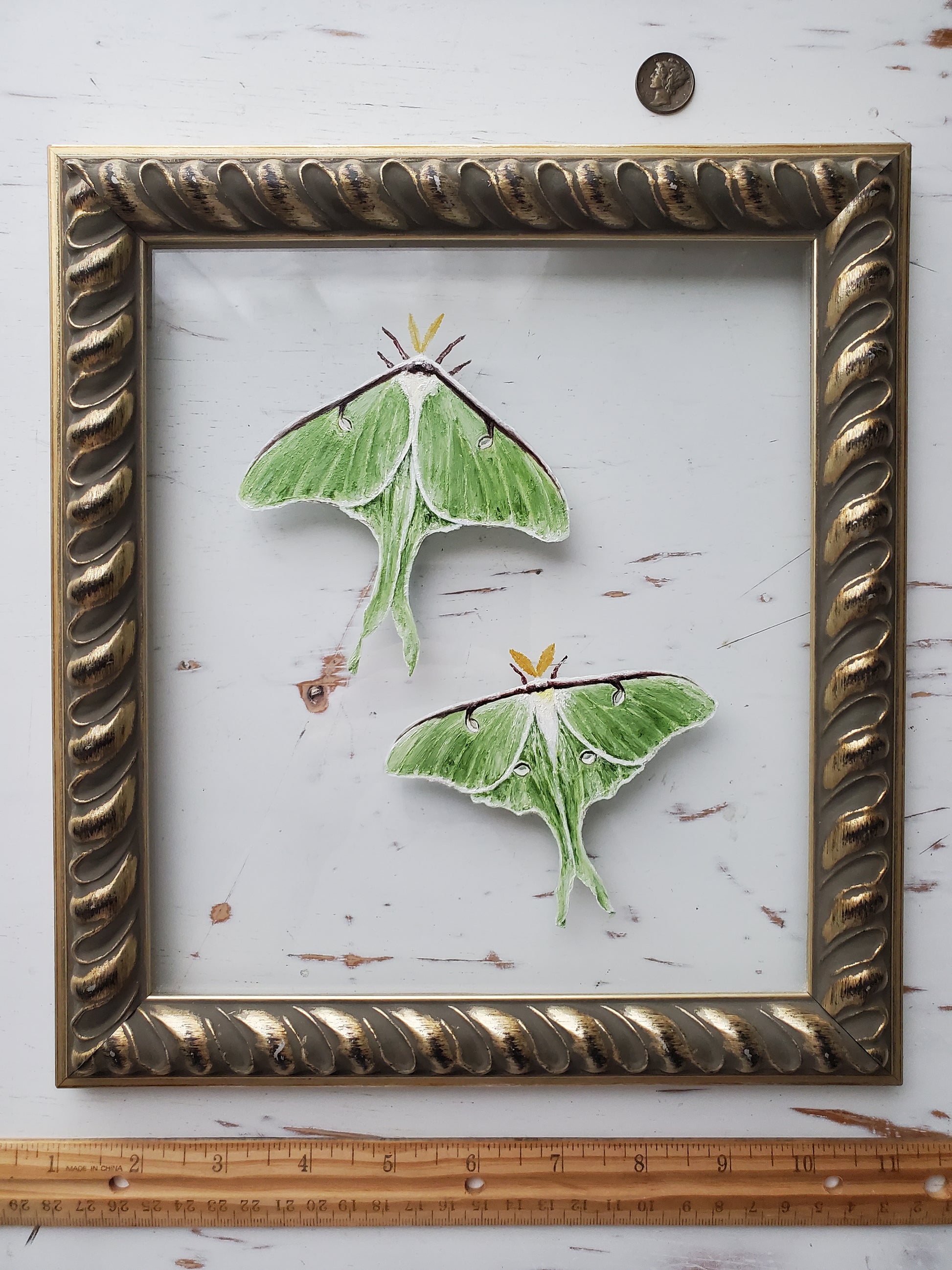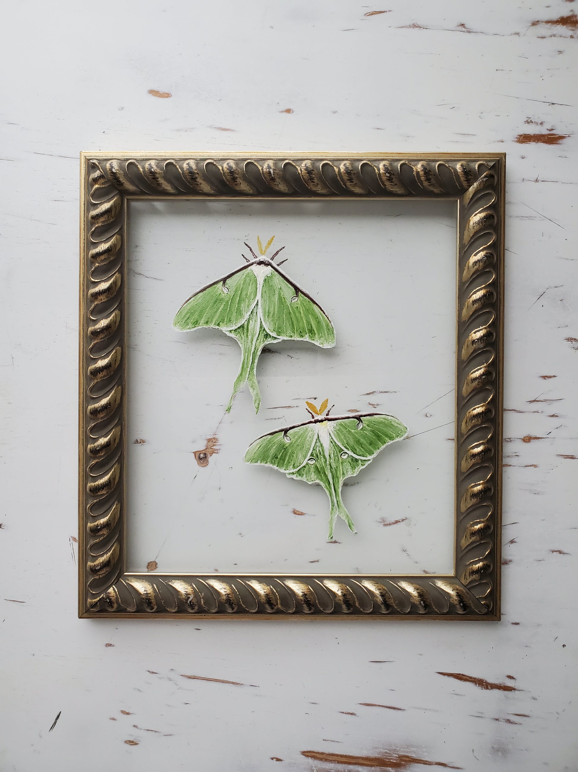 A pair of luna moths together in a silvery gold frame with rope design & aged finish